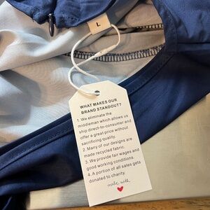 Navy blue with floral design around the bottoms. Elbow length sleeves. Crisscross/wrap top. Cropped/ankle length legs. Size Large. The world's most adorable model (Mom :)) in pics is 5' 5" 150 lbs, for reference.
