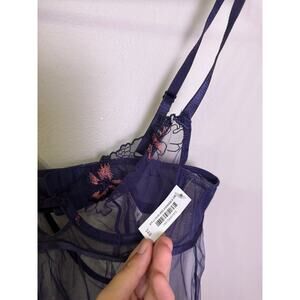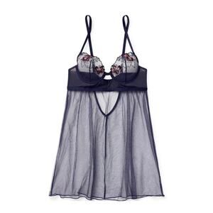 NWT Adore Me Navy Blue Floral Embroidered Mesh Babydoll Lingerie Butterfly 34B