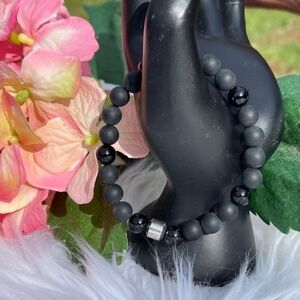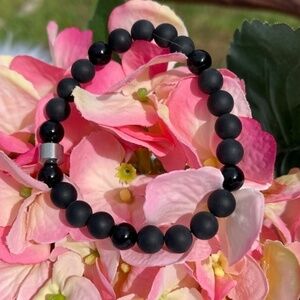 A rhodium plated bead, adorns an onyx beaded bracelet that stretches to fit most wrists