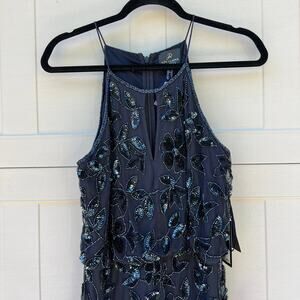 NWT Adrianna Papell Navy Twilight Floral Beaded Halter Floor Length Dress Sz 10