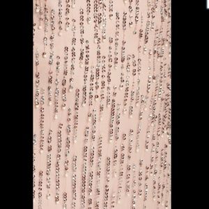 A floaty mesh gown in pale blush pink puts you in a shimmering spotlight with delicate rivulets of sequins and beads streaming down the front and back. A scooped neckline in back enhances the feminine elegance.