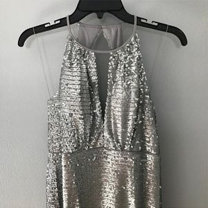 NWT Adrianna Papell Silver Sequin Paillette Gown, size 4. Gorgeous gown with open v-neck keyhole halter style with front hook closure. Open back keyhole style. Satin piping at waist, hidden zipper closure. Fully lined with sewn-in bra cups. Shell is nylon, lining is poly. 62” length, 33” bust, 13” waist, 10” from top of neck to waistline. Smoke and pet free home.