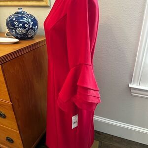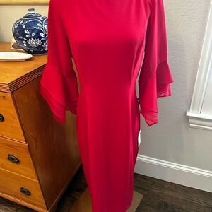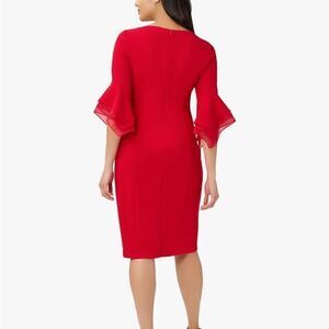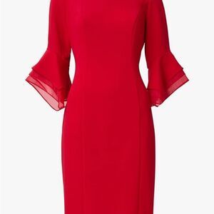Dressed up meets versatile in this timeless sheath dress. This midi dress features a boat neckline, fitted silhouette through the body, and tiered three-quarter bell sleeves with organza accents. Crafted using knit crepe, this day dress has some stretch and no waist seam for a comfortable fit. A zipper back closure and a single pleat at the center back of the skirt hem completes the design.