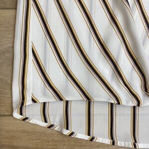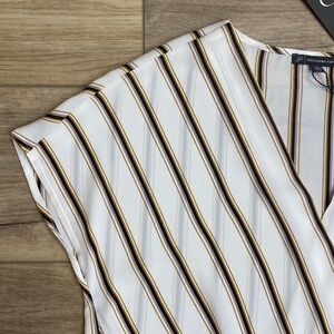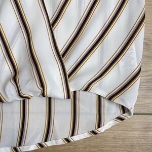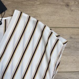 New with tags lightweight sleeveless Surplice draped front blouse by Adrianna Papell. A semi sheer white ecru with black, gold and mauve stripes print. Relaxed fit boxy top for an effortless everyday look. In flawless condition, Size Small S