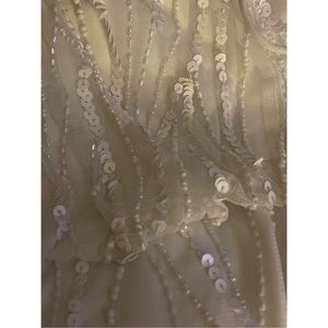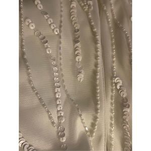 —Fully Lined—Spaghetti Straps—white Fur Stole—earrings—has beading and sequins all done by hand—absolutely Gorgeous on pit to pit 19”—waist 34-36”- dress has some stretch— armpit to hem 54”