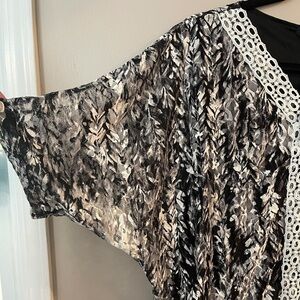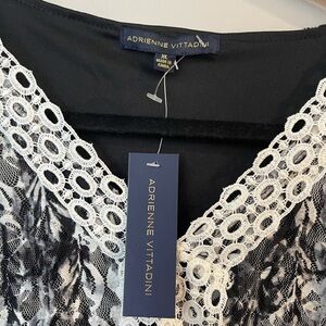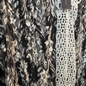 Black and white lace top with crochet detail around neckline and down front of shirt