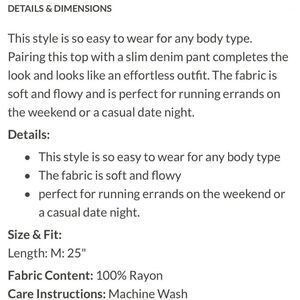 This style is so easy to wear for any body type. Pairing this top with a slim denim pant completes the look and looks like an effortless outfit. The fabric is soft and flowy and is perfect for running errands on the weekend or a casual date night.