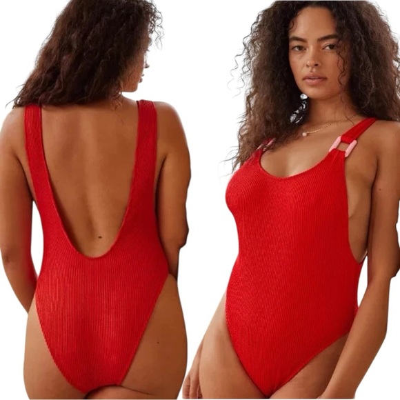 NWT Aerie Crinkle Birthday Scoop Cheekiest Red One Piece Swimsuit