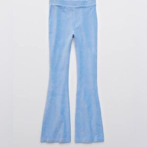 Elevate your wardrobe with these Aerie Groove-On Velour High Waisted Flare Pants. The ribbed blue velour fabric provides a comfortable and stylish fit for these flared pants, perfect for any occasion. The pull-on closure and flared leg style make them easy to wear and versatile for any outfit. The solid pattern and velour fabric type make them a great addition to any woman's clothing collection. Ideal for those looking for a comfortable and stylish pair of pants, these Aerie flare pants are a must-have.