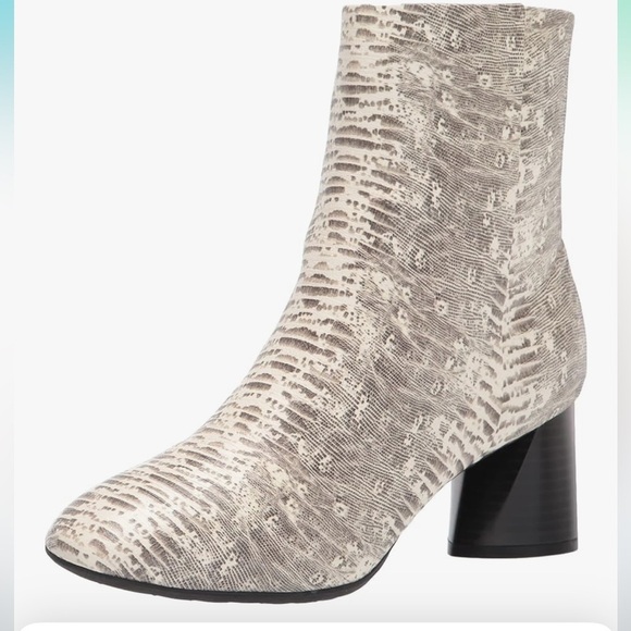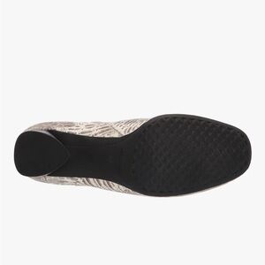 Elevate your style with these chic women's ankle boots. Featuring a unique cream and black pattern, these boots are perfect for any occasion. Step out in confidence and comfort. With a timeless aesthetic and chic-yet- comfortable stacked leather heel, the Myla stands out as a style essential from day to night. A secure zipper closure completes the look. 2 1/4" Heel Height. Leather Upper, Balance Synthetic Materials.