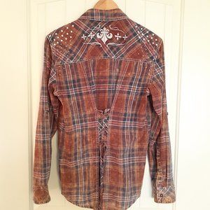 NWT Affliction Eagle Rock Long Sleeve Corset Back Shirt Brown Size M