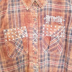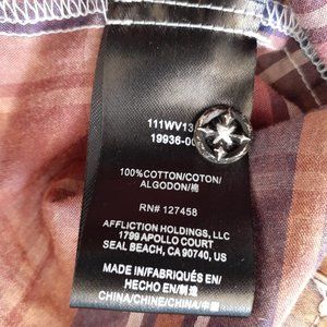 NWT Affliction Eagle Rock Long Sleeve Corset Back. Size Medium. 100% cotton. Machine wash. Button front, two chest pockets, and a corset back. White enamel stud detail on pockets and back shoulders. Embroidery above front pocket and back yoke. Lightweight cotton. Roll tab sleeves.
