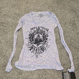 Elevate your style with the Affliction Women's Blue Graphic Top. Featuring a striking design, this top adds a bold touch to any outfit. Perfect for casual outings or a night out.