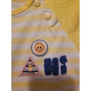 New with tags tshirt from kids boutique brand Aimama. Retailed for $30. Adorable yellow and white stripes with cute patches on the chest. Perfect for summertime. Snaps at the collar for easier on/off. No flaws to disclose- in new condition.