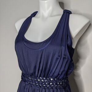 NWT Aijek navy satin maxi dress 10/12. Layered top and braided waist creating a fun design and peekaboo style. Zips up the side. Waist portion stretches. Bamboo polyester blend. Aijek size 3 is a US 10/12.