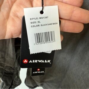 Keywords: Airwalk, men's shirt, button-up, long sleeve, black denim, casual wear, hooded shirt, adjustable drawstrings, chest pockets, fall fashion, machine washable, new with tags.