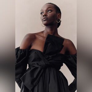 Elevate your style with the AJE Valentina Bow Midi Dress, a true embodiment of sophistication and timeless allure. This strapless dress exudes elegance with its bold twisted bow, adding a touch of architectural charm. The draped off-the-shoulder sleeves create a romantic and feminine silhouette, while the flaring hem adds movement and grace. Whether worn for a special occasion or a formal event, this dress is sure to make a lasting impression. Composition: 100% Cotton Poplin Colour: Black Off-shoulder neckline with long sleeves Bow tie bodice detail Tulip shaped skirt Side seam pockets Concealed zipper fastening at the back All-over gathered details Delicate cold hand wash seperately Excellent condition, no flaws.