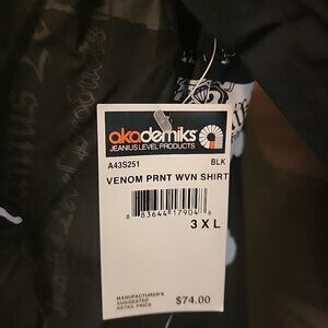 The product is a men's button-up shirt from Akademiks in size 3XL, featuring a venom print design in black color. This casual button-down shirt is perfect for adding a unique and edgy touch to any outfit. The bold character of the venom print makes it a standout piece for men looking to express their style with a pop of color and attitude.