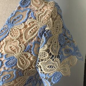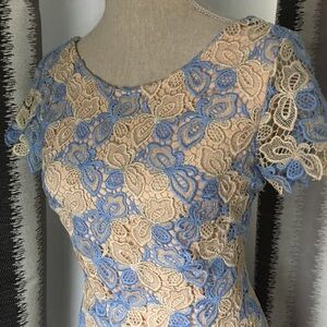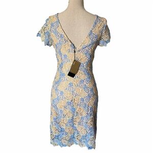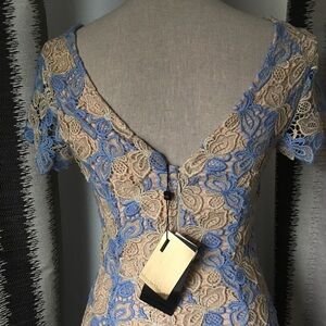 NWT! ALBERTO MAKALI gorgeous, romantic, feminine, elegant and chic lace dress. Size: Small. Color: blue/tan/golden metallic. Approximate measurements: Length - 36”, around chest - 33.5”, around waist - 27”, around hips - 34”. Features: scoop neck in the front, v-line in the back, hidden back zip closure, allover lace, fully lined. Fabric: polyester with metallic. Dress it up with a pair of heels or dress it down with a cute denim jacket! Purchased at Nordstrom. All tags attached.