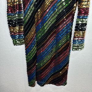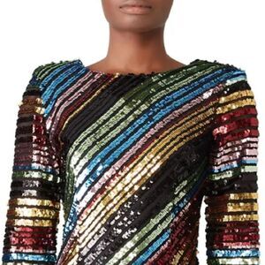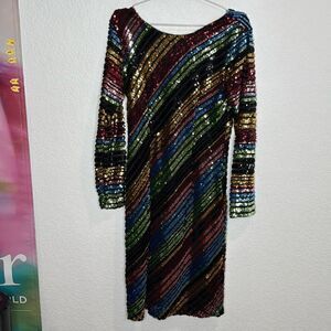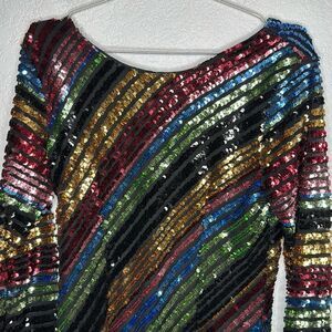 Rainbow printed sequins (100% Polyester). Sheath. Three quarter sleeves. Boat neckline. Hidden back zipper closure.