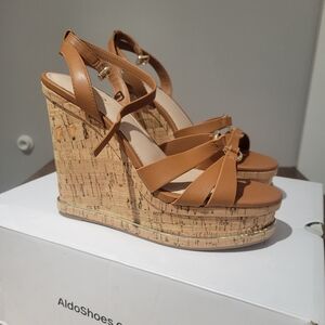 Brand new, unworn, cork bottomed wedges. Cognac color with gold accents.