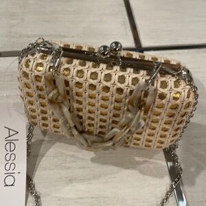 Brand new with tags attached. Bag measures 7” x 4” x 1 1/2“. Can use with a chain strap or as a clutch.