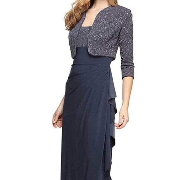 With this work by Alex Evenings 225196, you may get a dazzling style. This two-in-one dress is elegant and sophisticated, with a fitted bodice and a sleeveless square neckline. An optional cropped jacket patterned like the top bodice is included, along with a stylish faux wrap column skirt that starts at the empire waist and has a side slit.