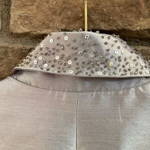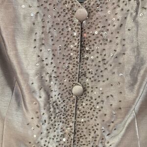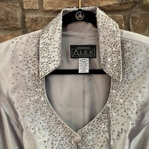 NWT Alex Evenings silver skirt and jacket outfit with sequin detail. Shoulders are padded. And pants have an elastic waistband with side zipper. Approximate measurements of the skirt is 17 at the waist and length is 41. Approximate measurements of jacket is 22 1/2 pit to pit and length from shoulder is 22. Size 16W