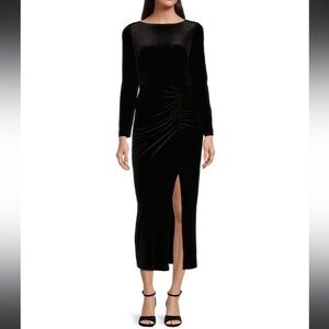 New With Tags Alex Marie Chloe Stretch Velvet High Boat Neck Long Sleeve Ruched Waist Side Split Hem Midi Sheath Dress