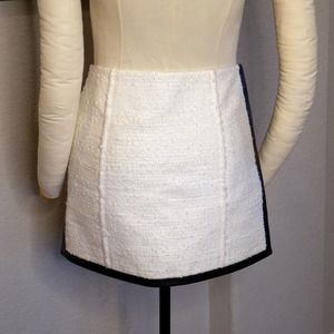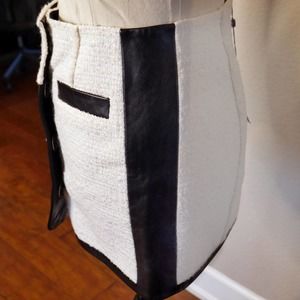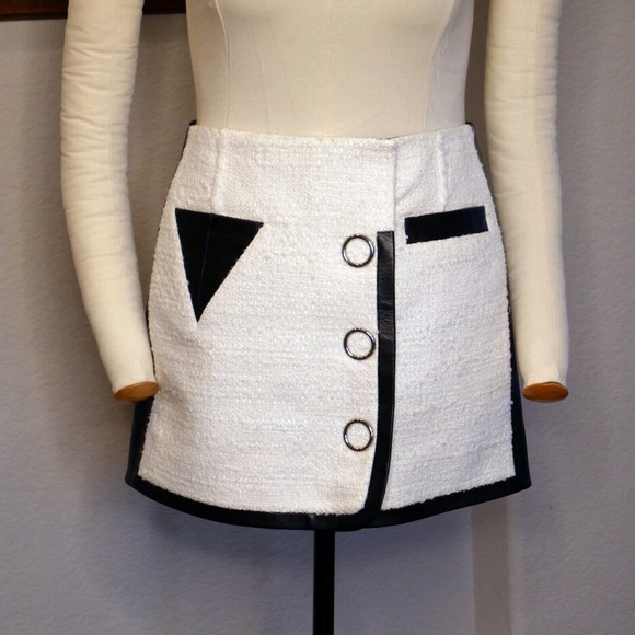So many details! This unique skirt by Alexander Wang features textured wool and cotton ivory boucle fabric and black leather accents. An inverted triangle, black stripes down the hips, leather edging, and large accent buttons highlight an effortless sophistication without being fussy.