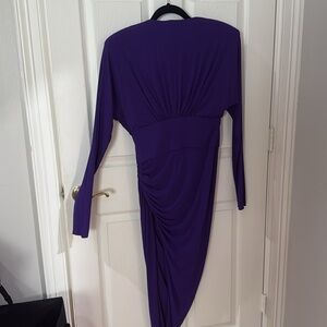 Elegant asymmetric hem deep violet dress by Alexandre Vautier in size 40. Has shoulder pads and plunge front. Rouching on side. Brand new. Smoke free home.