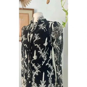 Step out in style with this stunning Alexis dress, new with tags. This beautiful designer piece features intricate black lace with striking white floral embroidery. Its tunic style and high collar add sophistication and grace, making it perfect for evening events or special occasions. Crafted from premium materials, this dress offers both elegance and comfort. It’s the perfect choice for anyone who loves high fashion and unique details.