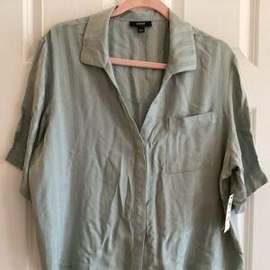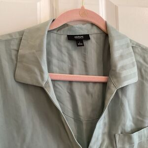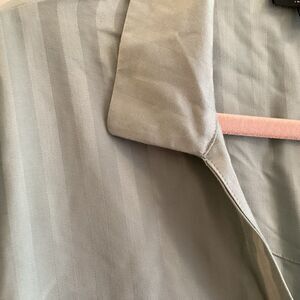 New with tags. Alfani, a Macy’s high end brand women’s size Large 2 pc pajama set. Stripe on solid light green, super soft rayon fabric. Long pj pants have a back elasticized waist, two working slit pockets and open side seams at the bottom. The short-sleeved pj top features an invisible button up front, v-Neck and collared. Showing photos of front and back sides with photos of fabric and care tags.