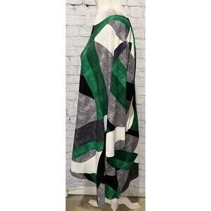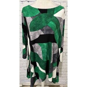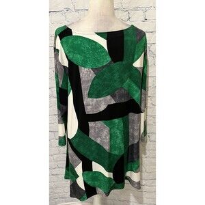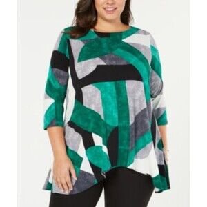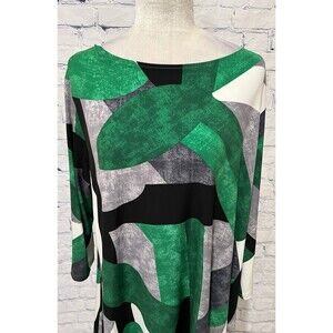 This NWT Alfani Plus Size Printed Handkerchief Blouse in XXL is a stylish and versatile top perfect for various occasions. The geometric pattern in green, gray, and black adds a pop of color to your wardrobe, while the 3/4 sleeves and boat neck neckline provide a flattering silhouette. Made from a stretchy polyester and spandex blend, this blouse offers comfort and ease of movement. Whether you're traveling, attending a party, dressing for casual or workwear, this tunic-style blouse by Alfani is sure to make a fashion statement. 24 inches pit to pit and 32 inches long. Smoke free home.