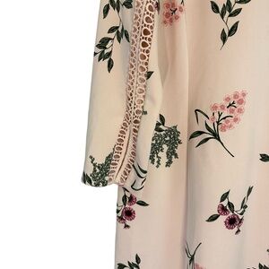 Pink floral dress, work dress, casual dress, event dress, versatile dress, comfortable, zipper in back, lace details, medium weight, 3/4 length sleeves, simple classic design