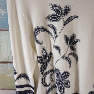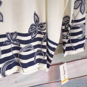 Stylish white and navy striped floral sweater. Perfect for any occasion.