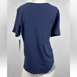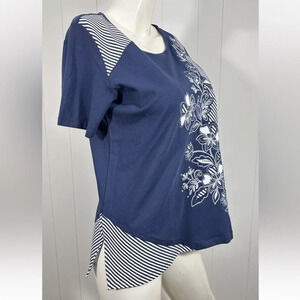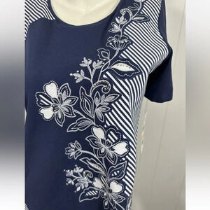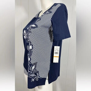 NWT Alfred Dunner Embroidered Floral Rhinestone Top Navy Blue Sz S Short Sleeve