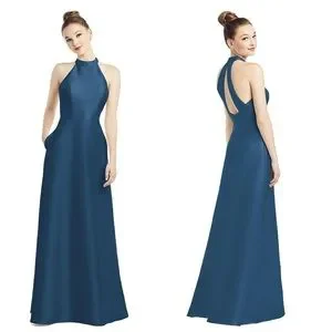 NWT Alfred Sung Dusk Blue Bridesmaid Sateen Full Length High Neck Twill Dress 4