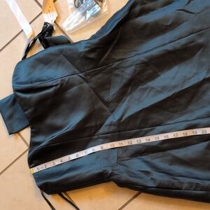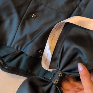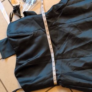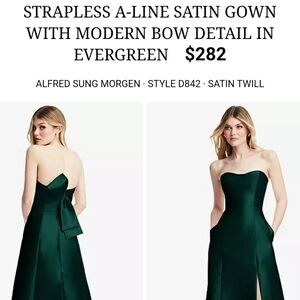 New with tag Alfred Sung style D842 Strapless A-line Satin Gown with Modern Bow Detail in Evergreen. Size 14 please see measurements pictures to be sure of fit. Retail: $282