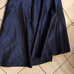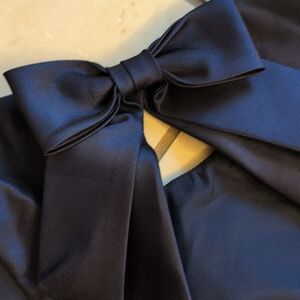 New with tag Alfred Sung style D824 Jewel Neck gown maxi trumpet Dress in Midnight dark Navy Blue. Leg slit in front. Open back with a bow at the back of the neck. High-quality Satin twill. Lined. Size 2 please see measurements pictures to be sure of fit. Retail: $240 Offers welcome!