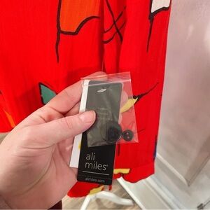 NWT Ali Miles Red Geometric Button Down Shirt. Size Small. In new condition with no flaws. Tags attached. Bright red with colorful geometric pattern. Wire in collar so you can adjust to your liking. Size small. Runs slightly oversized in fit.