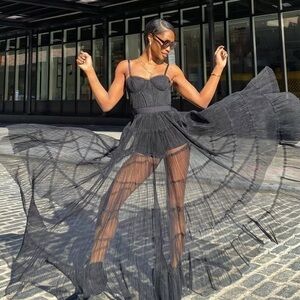 This gorgeous maxi dress has ballet vibes, with a tulle overaly and camisole construction. It's lined where you need it to be, but is left ethereal and transparent in all the right places, too.