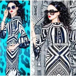 A dress that'll get you on the dance floor, this includes sequins that sparkle with every step and turn. The geometric print and 3/4 length sleeves have Studio 54 vibes that we can't get enough of.