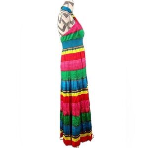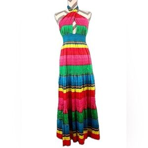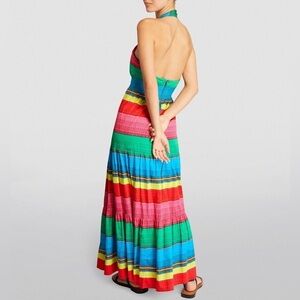 Lyndon halterneck maxi dress from Alice + Olivia featuring multicolour, cotton blend, colour-block panelled design, cut-out detailing, halterneck and sleeveless. Back zipper closure.