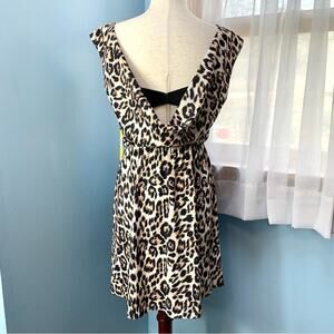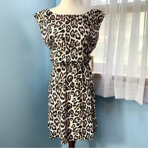 A gorgeous leopard print dress that could be dressed up with heels for an evening look or paired with flats or sandals for daytime. An elastic waist creates volume on the top which is complemented by the low drape in the back with an elastic strap accent. A black or brown belt can change up the look! The dress is fully lined with a tan lining that fits closer to the body and cover more of the armholes. Retail price: $396