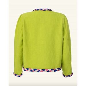 Hand-loomed Khadi cotton, our chartreuse jacket has a classic fit. Hand-braided silk remnants adorn the jacket’s borders, cuffs, and patch pockets. Hits at the hip. Easy fit. 100% Cotton Khadi. 100% Hand Printed Cotton Lining. Shoulder Pads. Dry Clean Only. Made in India.