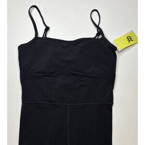 The NWT All In Motion Women's Everyday Soft Active Black Bodysuit in size small is a comfortable and stylish romper made of 21% spandex and 79% nylon. It features a back cut out accent, adjustable straps, removable pads, and a padded design, making it perfect for everyday wear or active pursuits. The bodysuit has a 26.75-inch inseam length and comes in a classic black color, featuring the All In Motion brand and a regular fit for women looking for a versatile and practical piece of clothing.