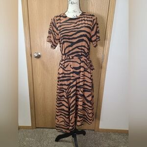 This dress features a striking animal print pattern with a rich brown base and black stripes. It has a flattering A-line silhouette with a fitted waist and a crew neck, making it perfect for casual or work occasions. The short sleeves add a touch of comfort and style to this eye-catching garment. 17.5" armpit to armpit, 40" long