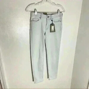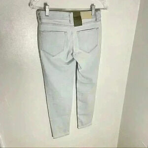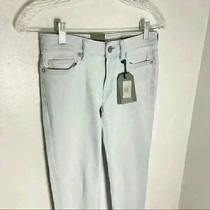 Description: Cropped light wash jeans; light distressing; zip and button closure; five pocket construction.