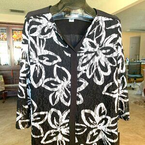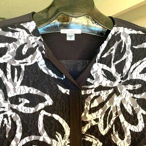 This is a NWT Allison Daley Tunic Top in a woman's size 2X. It is new and unworn, still with the tags attached. Original retail was 43.00. Fabrication is 100% polyester. It features 3/4 length sleeves, a split neckline and back yoke. It has a pretty black and white lace outer layer over a black lining for the body of the blouse. The sleeves are lace without the lining. It measures 27 inches around under the arm and 29 inches from the shoulder to the hem. Washing instructions are to machine wash cold and tumble dry low. This is a very pretty tunic style blouse, perfect for that dressy occasion. A wonderful addition to your Fall wardrobe